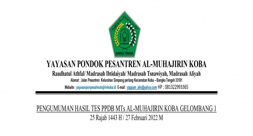 PENGUMUMAN KELULUSAN GELOMBANG 1 PPDB MTs AL-MUHAJIRIN KOBA TAHUN 2022